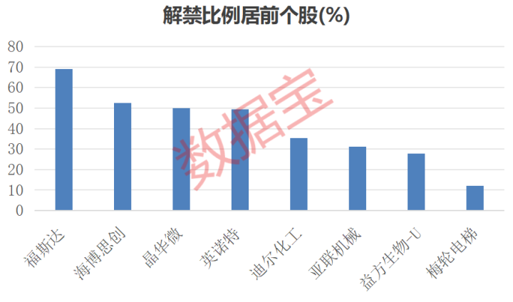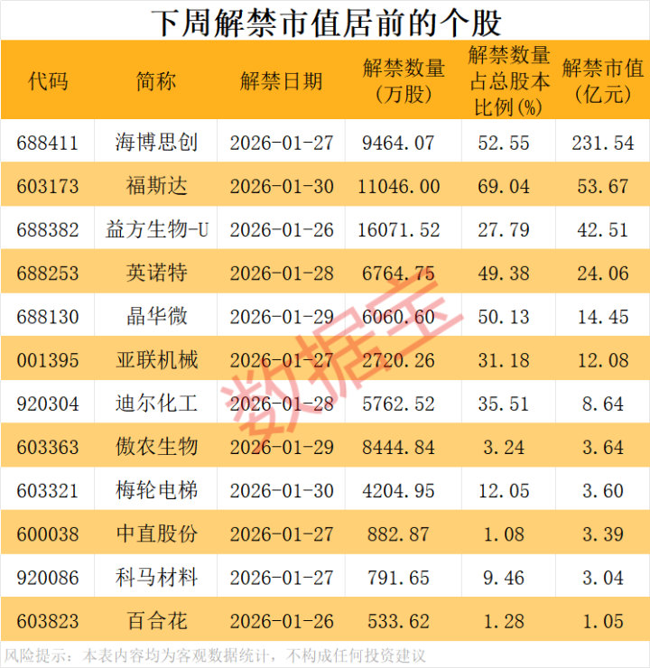 有12股解禁市值超1亿元,其中海博思创解禁市值超200亿元,福斯达、益方生物-U解禁市值均超40亿元。